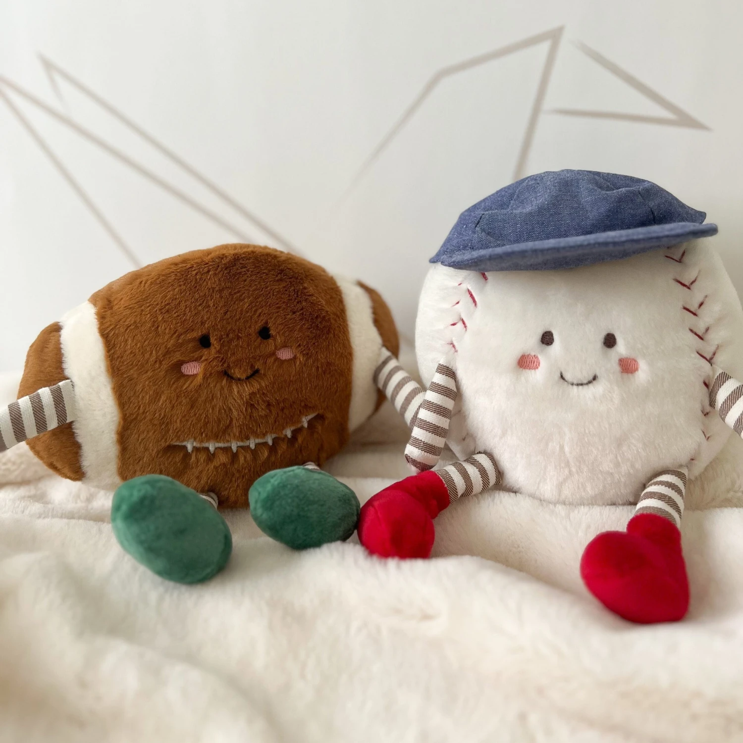 Meet Buddy Baseball, the cutest little slugger around! This plush baseball features soft white fur with classic red stitching, giving it a playful and sporty look. Buddy’s friendly embroidered smile and rosy cheeks make him irresistibly charming, while his striped arms and legs add a fun touch. Topped with a stylish blue cap and finished off with bright red plush shoes, Buddy Baseball is ready to hit a home run in the cuddle game. Perfect for little sports fans who love a good snuggle!