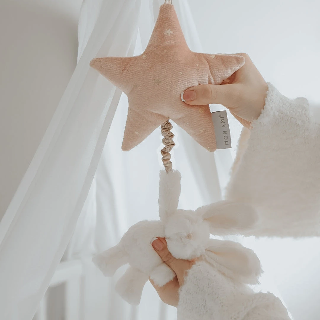 Give the gift of sweet dreams with our enchanting Bunny Music Mobile! This cuddly little bunny, with its soft fur and gentle Brahm’s lullaby, is ready to whisk babies off to dreamland. Just give the plush bunny a gentle tug, and let the soothing melody work its magic. The pink foil printed star adds a touch of sparkle and easily attaches to cribs or strollers with a Velcro loop, bringing cozy comfort anywhere. A charming baby shower gift, it’s music to every baby’s (and parent’s) ears!