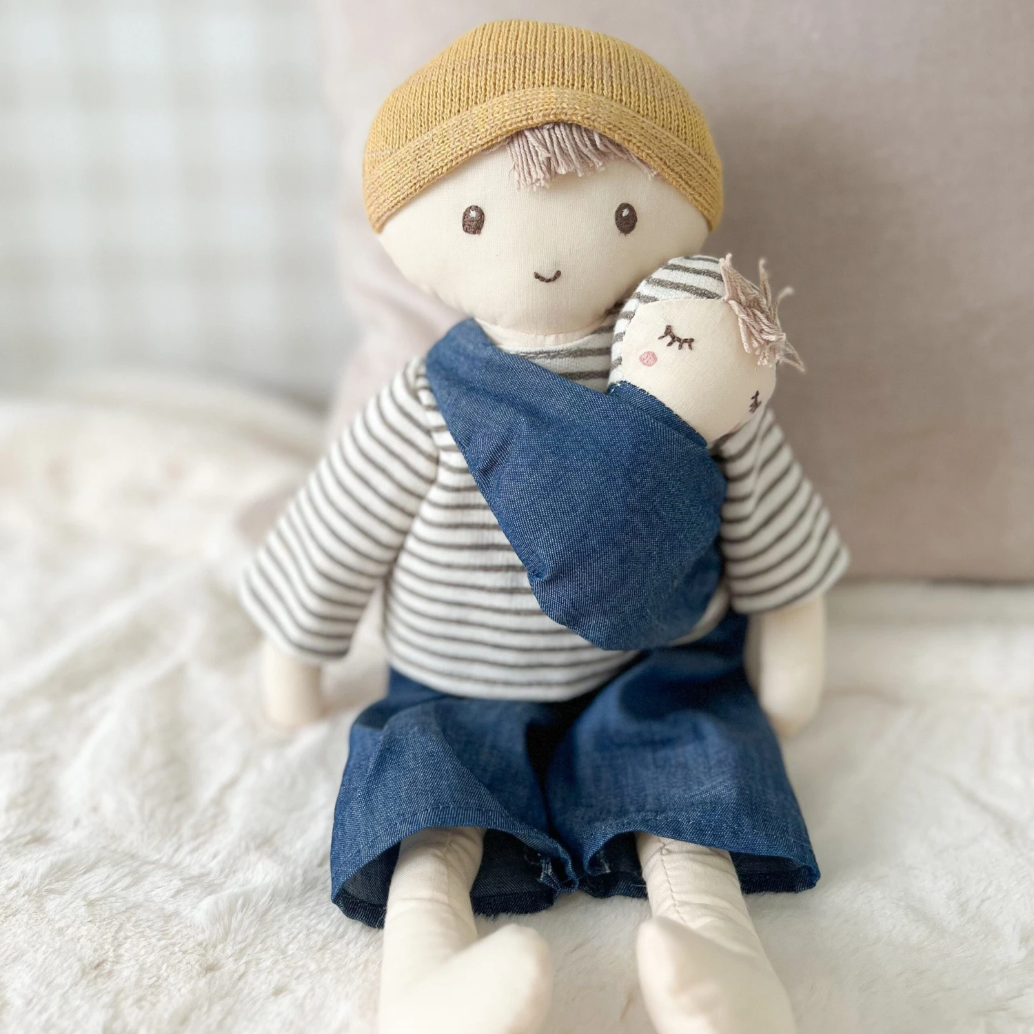 Meet Dada & Baby Doll duo! Dressed in a classic striped shirt, denim pants, and a cozy mustard knit beanie, Dada is ready for endless adventures with his little one snugly tucked into a baby carrier. With their sweet, matching smiles and adorable style, this charming pair is perfect for little ones who love to play pretend. A fun and delightful addition to any doll collection, they’re ready to bring hours of imaginative play and cuddles to your child’s world.