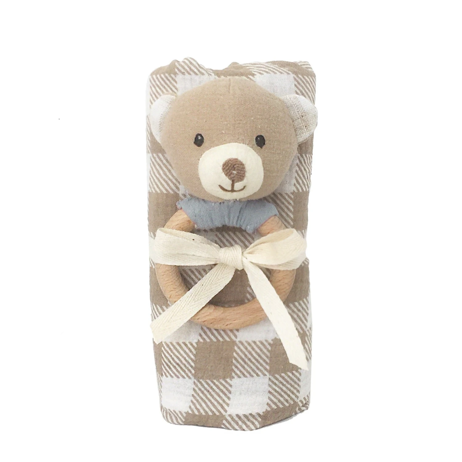 Found: the perfect baby gift set. Just in time for spring and summer showers, Mon Ami?€?s introduces a covetable newborn gift set: a beautiful gingham muslin baby blanket and a wooden baby ring rattle topped with an adorable bear. Timeless and meticulously crafted, our thoughtful baby gift set is ideal for any little boy. The ultra-soft muslin baby blanket??is designed for swaddling the bundle of joy while the wooden baby ring rattle provides amusement, engagement, and sensory development.