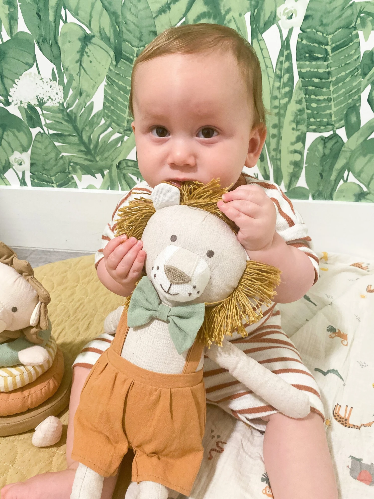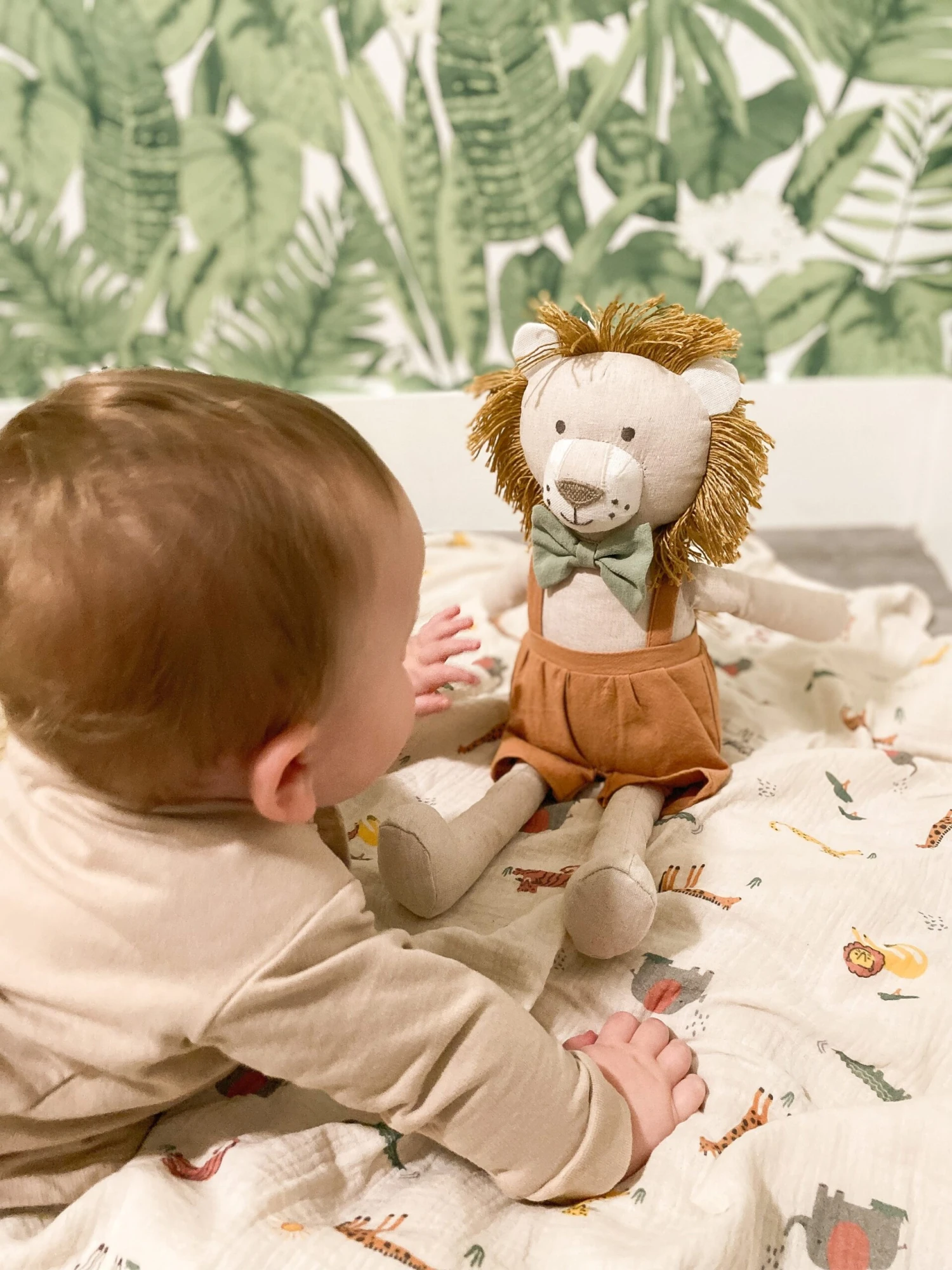 Leopold Lion Doll is ready to roar! Dressed with dapper bow tie and overalls, his charming embroidered face and tassely mane will delight you!