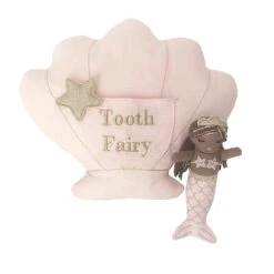 Now there is a tooth fairy pillow for all the mermaid fans! A sweet shell shape tooth fairy pillow and small mermaid doll adds extra fun to the experience and looks great displayed on beds. The mini-mermaid doll can be stored in the small front pocket …also used for money and trinkets from the ever-elusive tooth fairy!