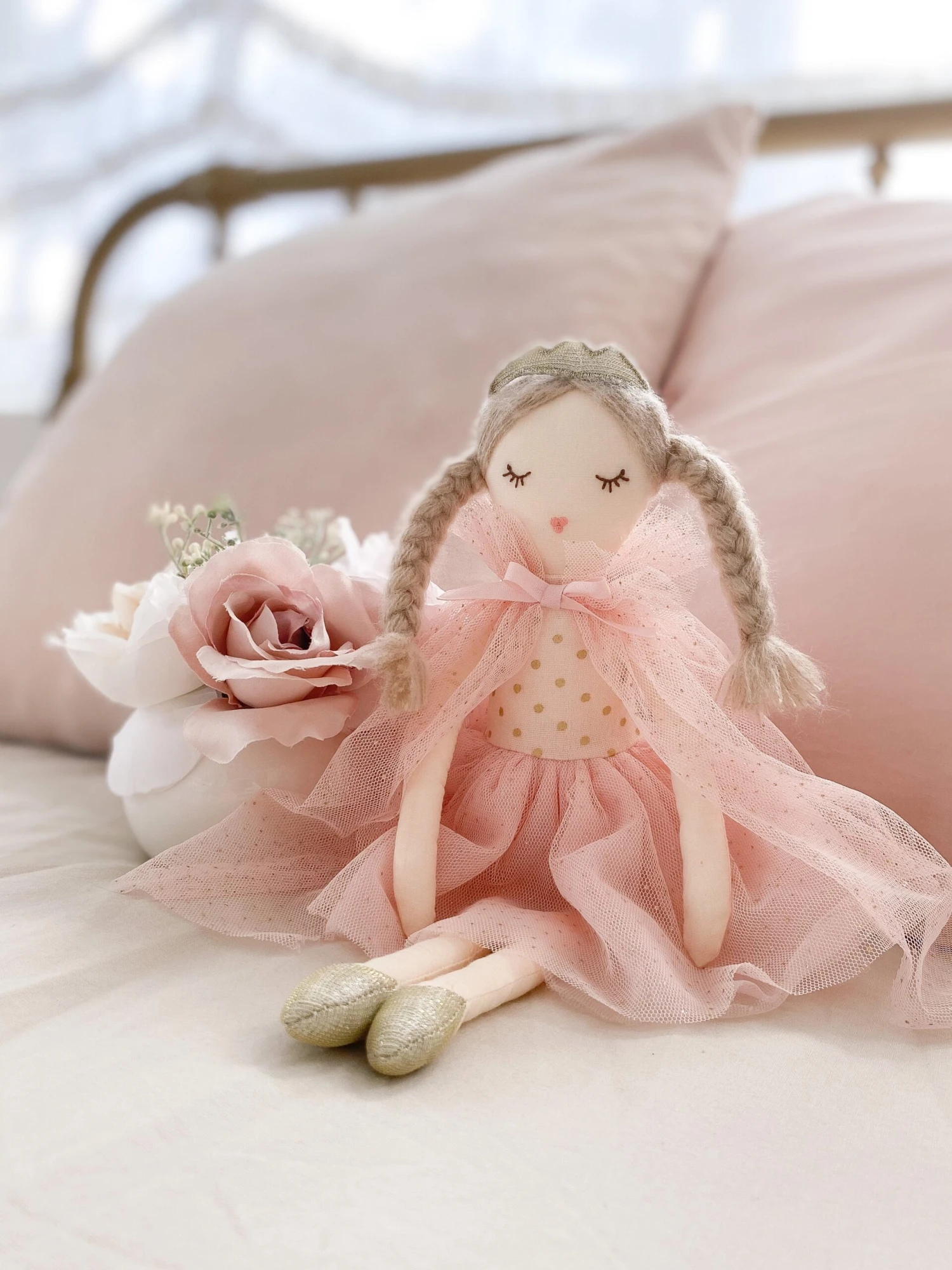 Princess Madeline in pink tulle cape and gown with golden stars and crown is perfect for any little girl; this stunning ballerina plush doll opens the door to a world of imagination!