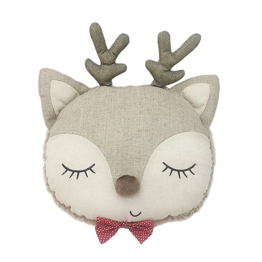 Merry Reindeer Pillow in taupe linen with festive red bow tie is charming decor for the holiday season!