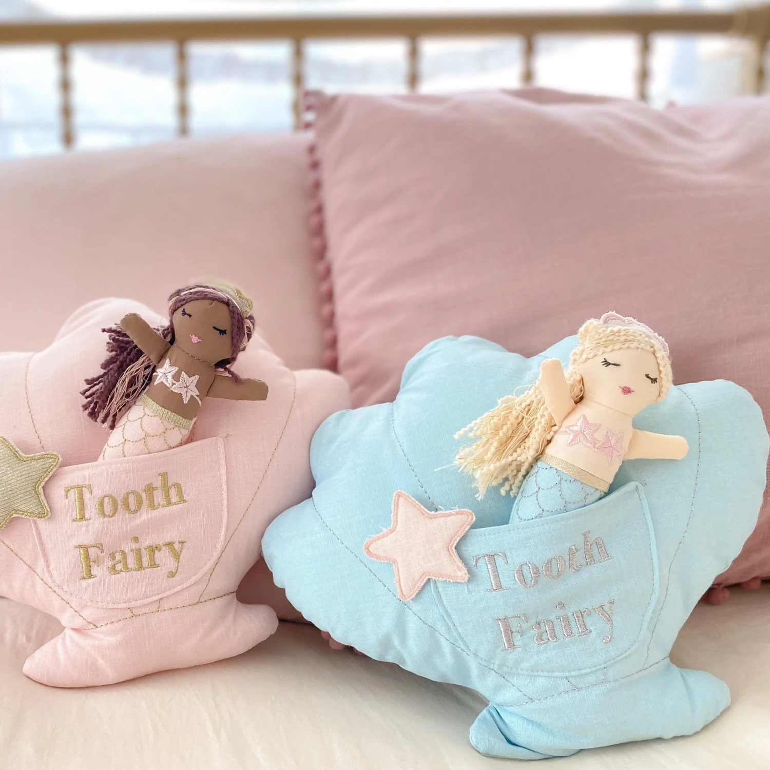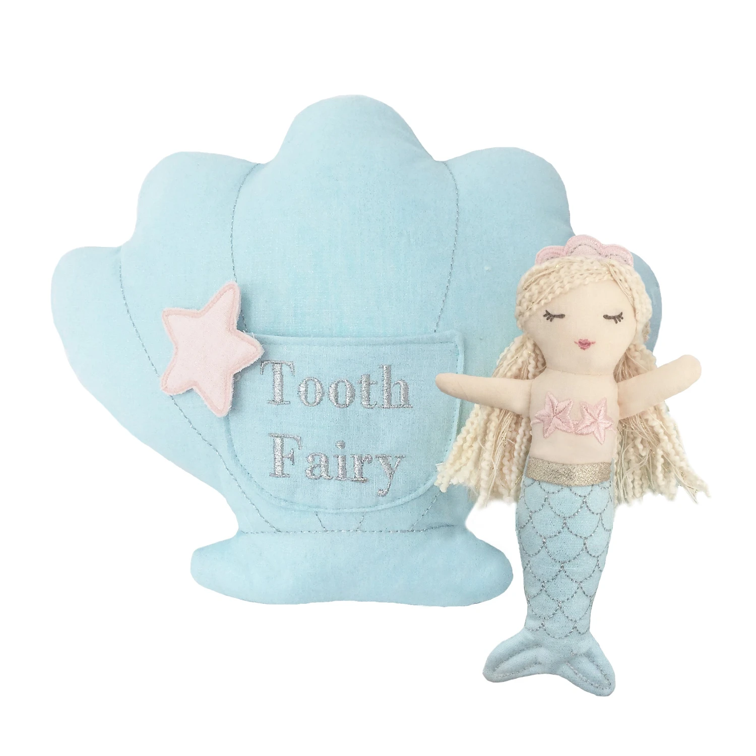 Now there is a tooth fairy pillow for all the mermaid fans! A sweet shell shape tooth fairy pillow and small mermaid doll adds extra fun to the experience and looks great displayed on beds. The mini-mermaid doll can be stored in the small front pocket …also used for money and trinkets from the ever-elusive tooth fairy!