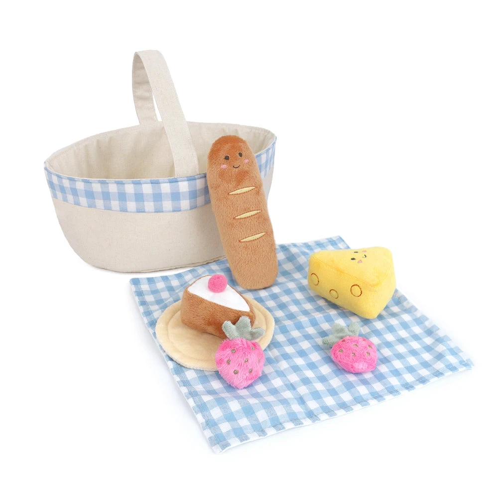 Get ready for endless fun with our Plush Picnic Playset! Packed with all the essentials for a perfect picnic, this 7-piece set by Mon Ami includes everything from a plush baguette and cheese block to fresh strawberries and a slice of cake. The gingham-trimmed soft basket keeps everything tidy and ready to go, along with a coordinating picnic mat for outdoor adventures. Whether at home or on a family outing, this adorable playset encourages imaginative play while helping little ones develop fine motor skills. With its charming details this Plush Picnic Playset is sure to make every picnic a delight.