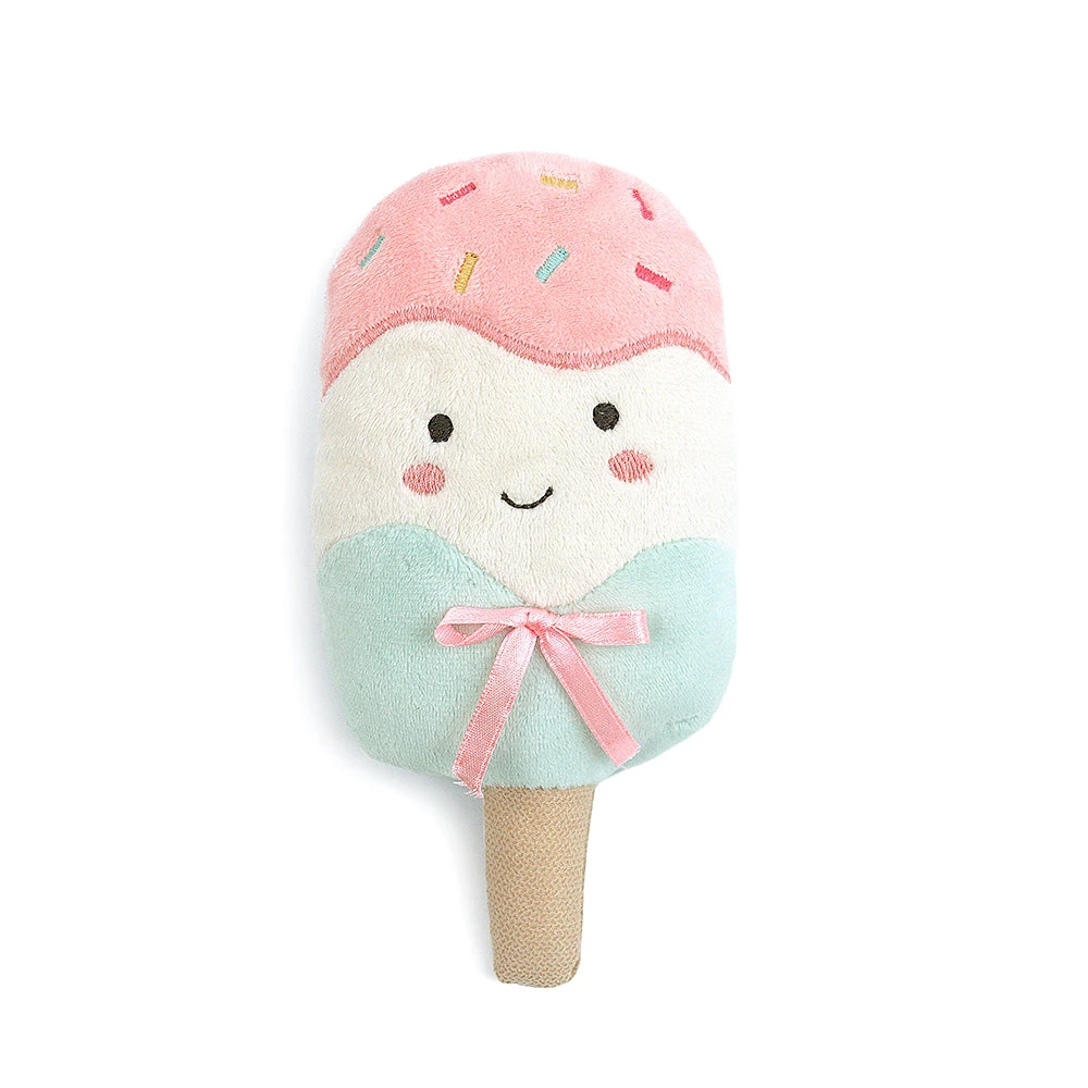 How sweet it is! Mon Ami’s Popsicle Chime Toy stimulates a baby’s developing senses of sight, sound and touch. Cheery pastel colors grab a child’s eye while the ultra-soft velour and sweet satin ribbon of this plush chime toy inspire fingers to touch. Best of all, this playful popsicle chime toy emits a soft jingle when shaken, encouraging a child to play over and over again. Elevate crib time and tummy time by wobbling our soothing plush chime toy for your wee one.