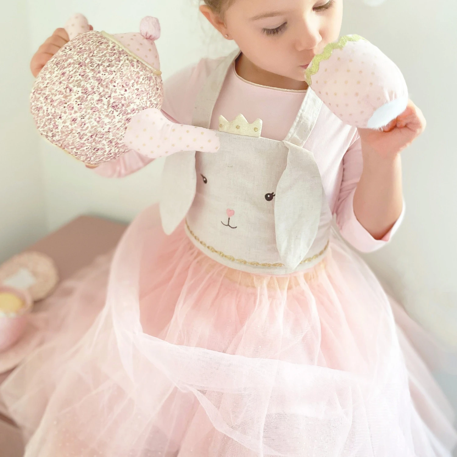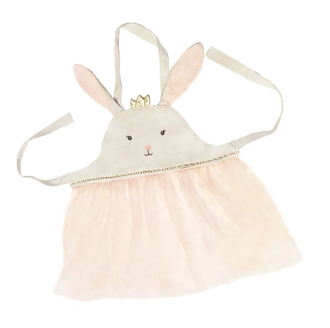 This is no ordinary apron! Made of linen and organza, this bunny apron has linen ties and with velcro closure and ties around the waist. Beautiful for tea time and play, the organza skirt makes this fit for a princess!
